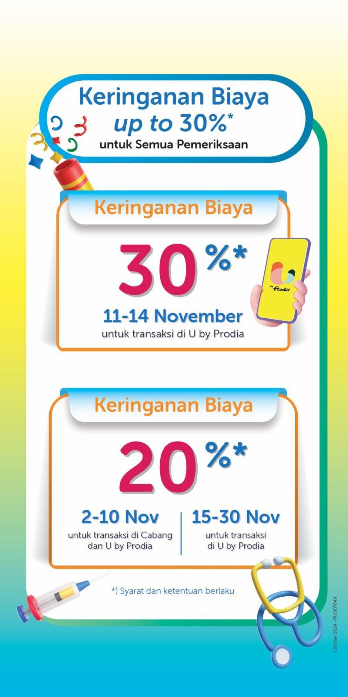 Untuk mendukung masyarakat dalam berinvestasi pada kesehatan masyarakat, Prodia memberikan menyediakan keringanan harga hingga 30% untuk semua pemeriksaan selama bulan November 2024. Anda dapat memanfaatkan penawaran ini melalui aplikasi U by Prodia atau datang langsung mengunjungi ke cabang Prodia terdekat. Informasi lebih lengkap tersedia di dapat diakses melalui www.prodia.co.id.