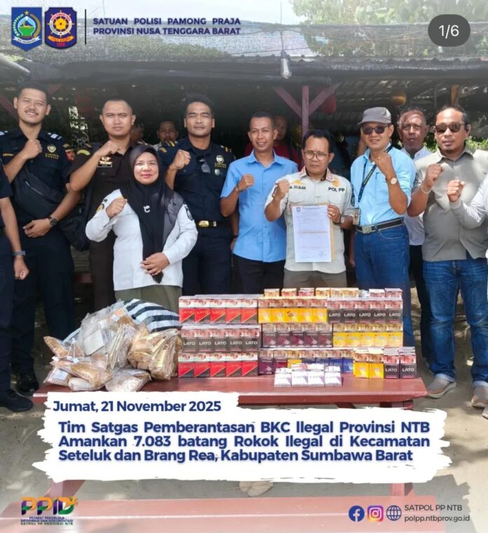 Mataram (ekbisntb.com)- Satuan Tugas Pemberantasan Barang Kena Cukai (BKC) Ilegal Provinsi NTB kembali menggagalkan peredaran rokok ilegal di Kabupaten Sumbawa Barat. Dalam operasi yang digelar pada Jumat, 21 November 2025, tim berhasil mengamankan 7.083 batang rokok ilegal dari dua kecamatan, yaitu Seteluk dan Brang Rea.